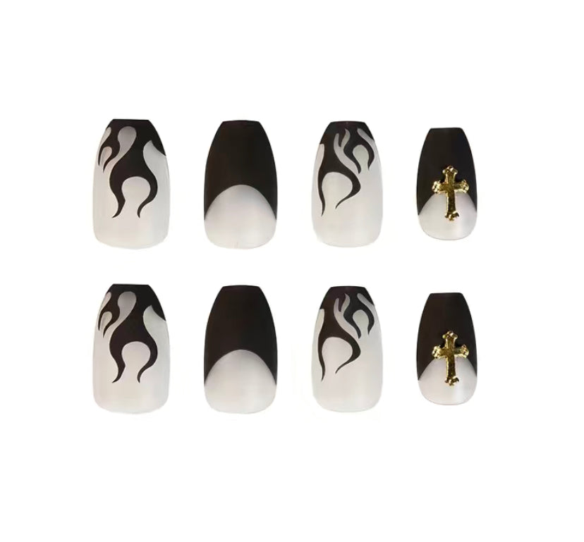 French Press On Nails with Black Flame Cross Design