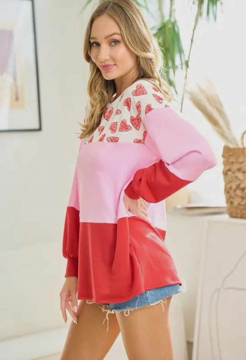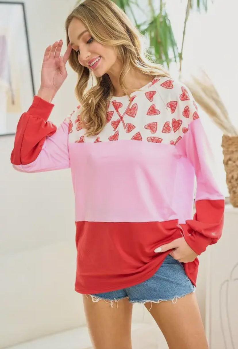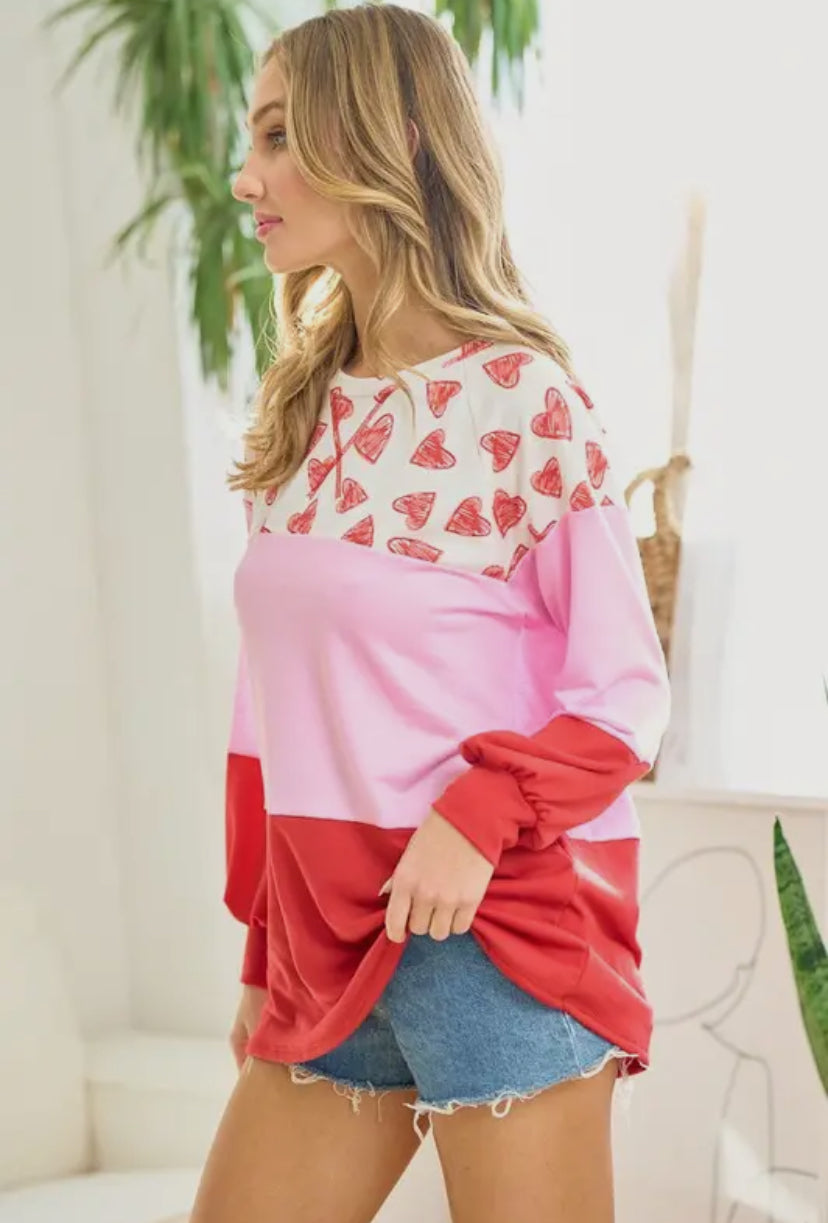 This long sleeve top is so cute and colorful. The heart design really accentuates any outfit. Add a pair of jeans to this top and you are ready for your day.