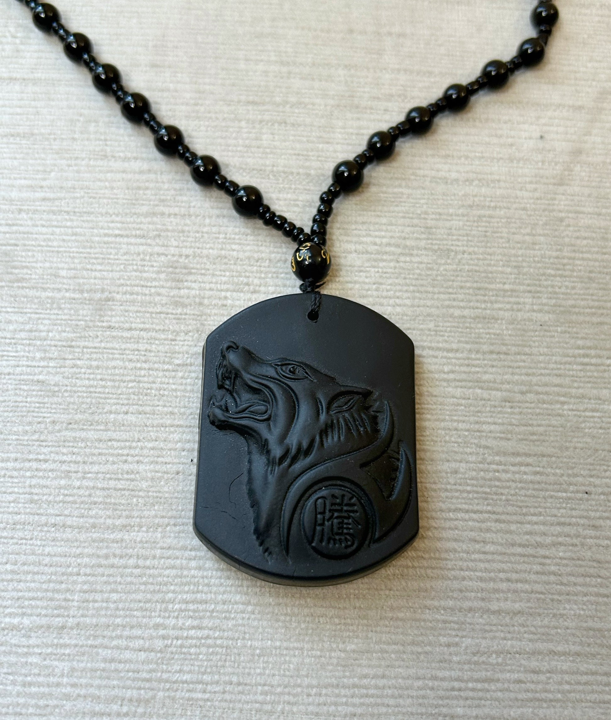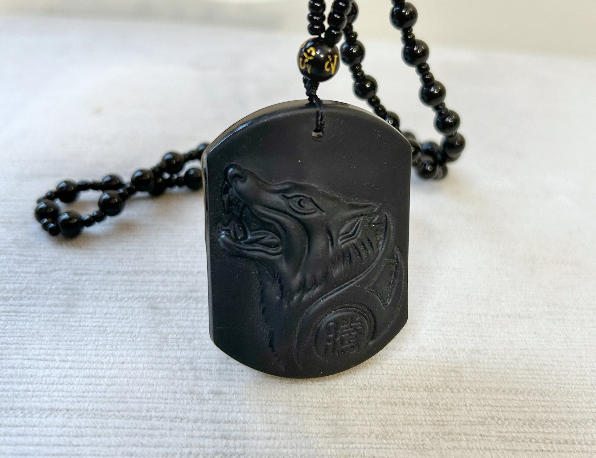 Natural Black Obsidian Carving Wolf Head Amulet Pendant Necklace Obsidian